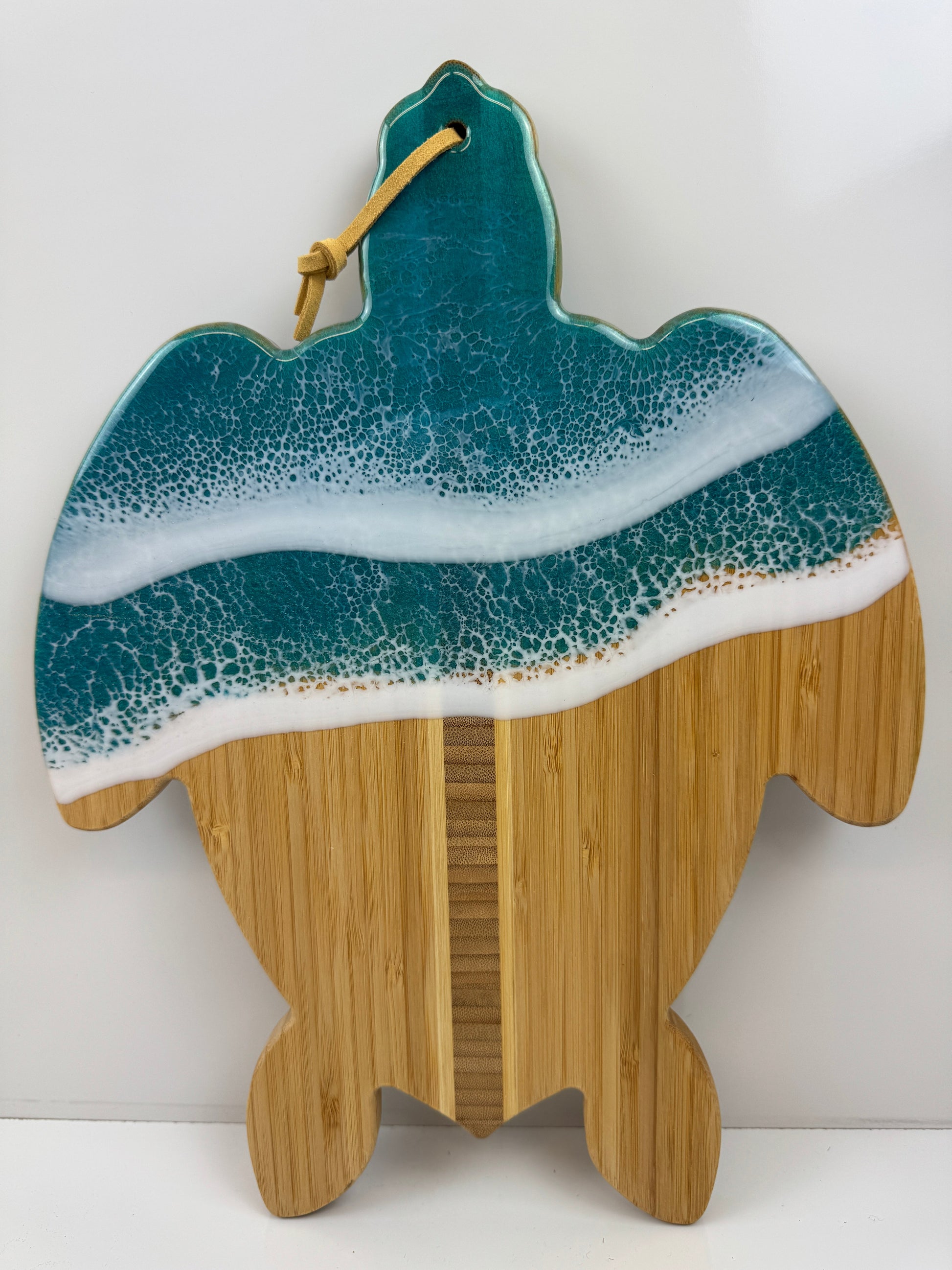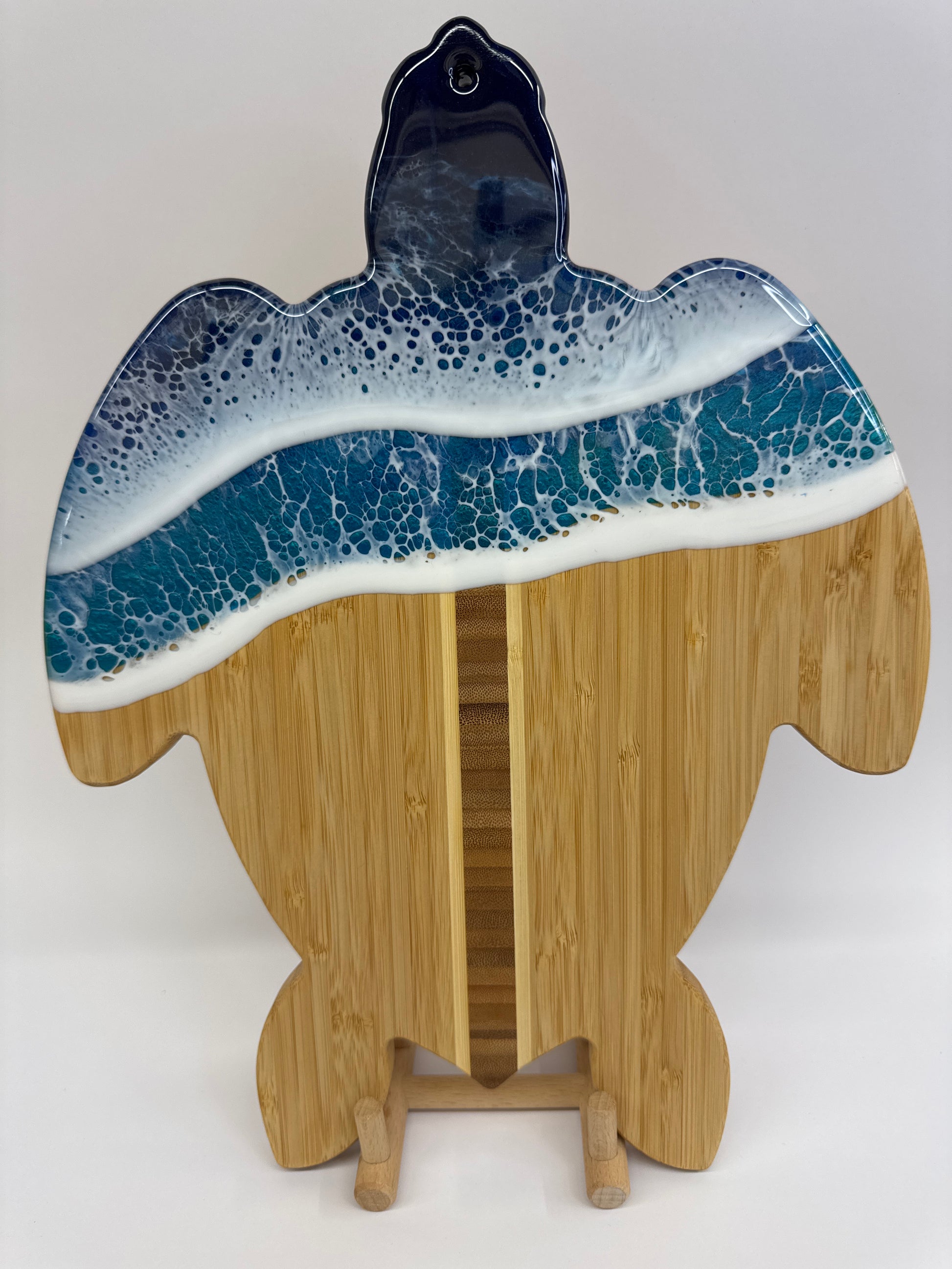 Bring the ocean into your home with a beautiful, hand-crafted charcuterie board. The ocean theme is brought to life with swirling shades of blue, turquoise, and white epoxy resin, mimicking the movement of water and the foam of crashing waves. Each board is handmade, so while they will look similar in style, no two are identical, ensuring that your piece is unique. Our charcuterie boards not only serve as a practical item for entertaining but also as a functional piece of art that captures the beauty of the ocean, making it a unique centerpiece for any gathering.