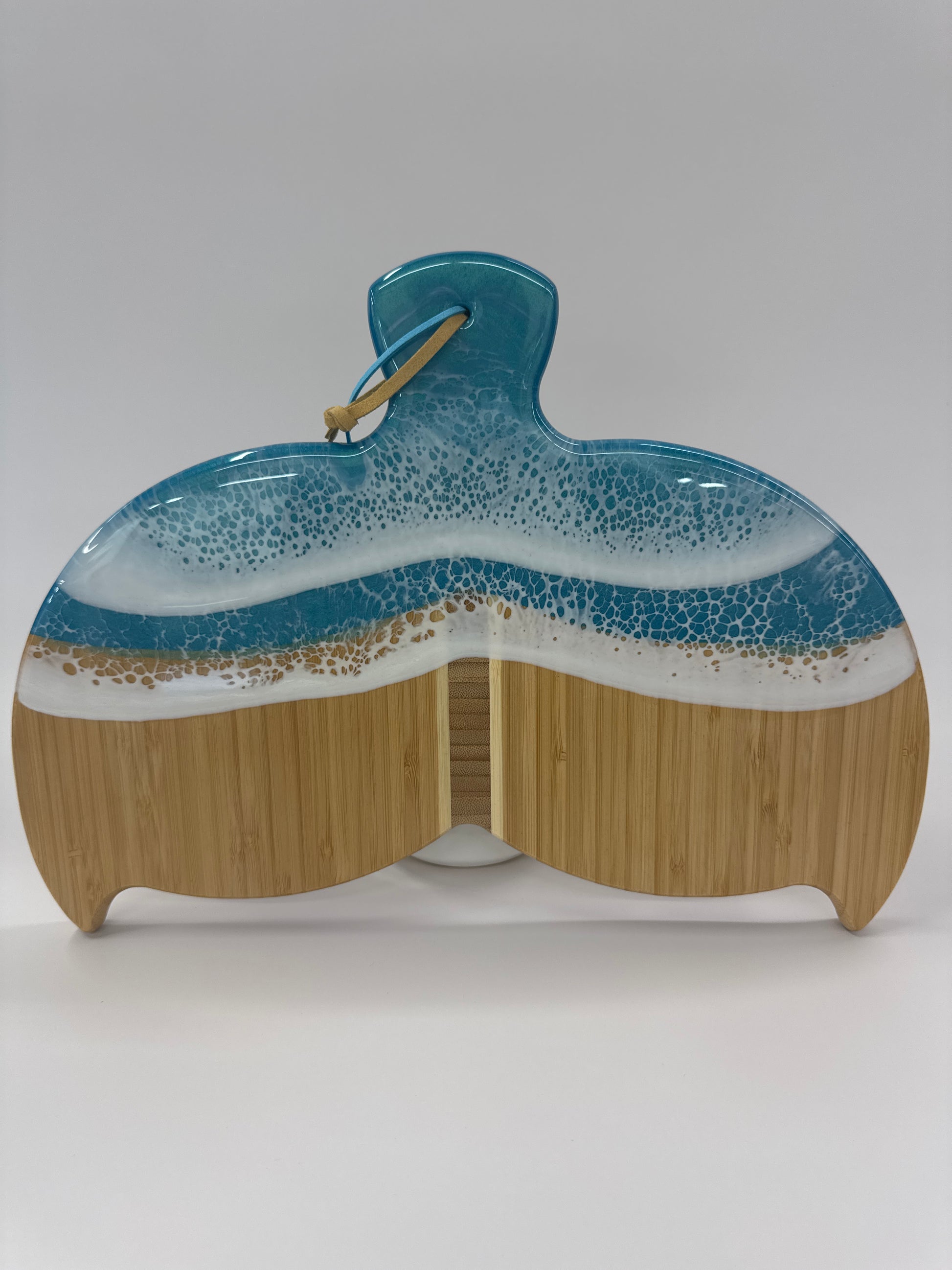 Bring the ocean into your home with a beautiful, hand-crafted charcuterie board. The ocean theme is brought to life with swirling shades of blue, turquoise, and white epoxy resin, mimicking the movement of water and the foam of crashing waves. Each board is handmade, so while they will look similar in style, no two are identical, ensuring that your piece is unique. Our charcuterie boards not only serve as a practical item for entertaining but also as a functional piece of art that captures the beauty of the ocean, making it a unique centerpiece for any gathering.